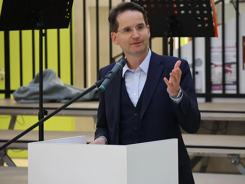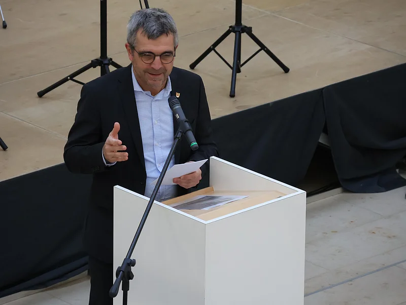 Stefan Liepold, der stellvertretende Leiter des Gymnasiums, schilderte in seinem Redebeitrag die aktuelle Lage der Schule und bedankte sich beim Sachaufwandsträger und allen Beteiligten, dass dieses Erweiterungsprojekt trotz finanzieller Herausforderungen zum wohl vieler Schülergenerationen angegangen worden ist. Der musikalische Rahmen der Veranstaltung kam von der Bläsergruppe des Gymnasiums unter der Leitung von Theresa Schnizlein.