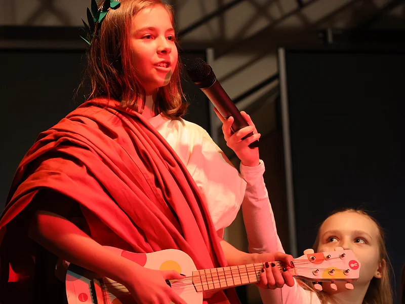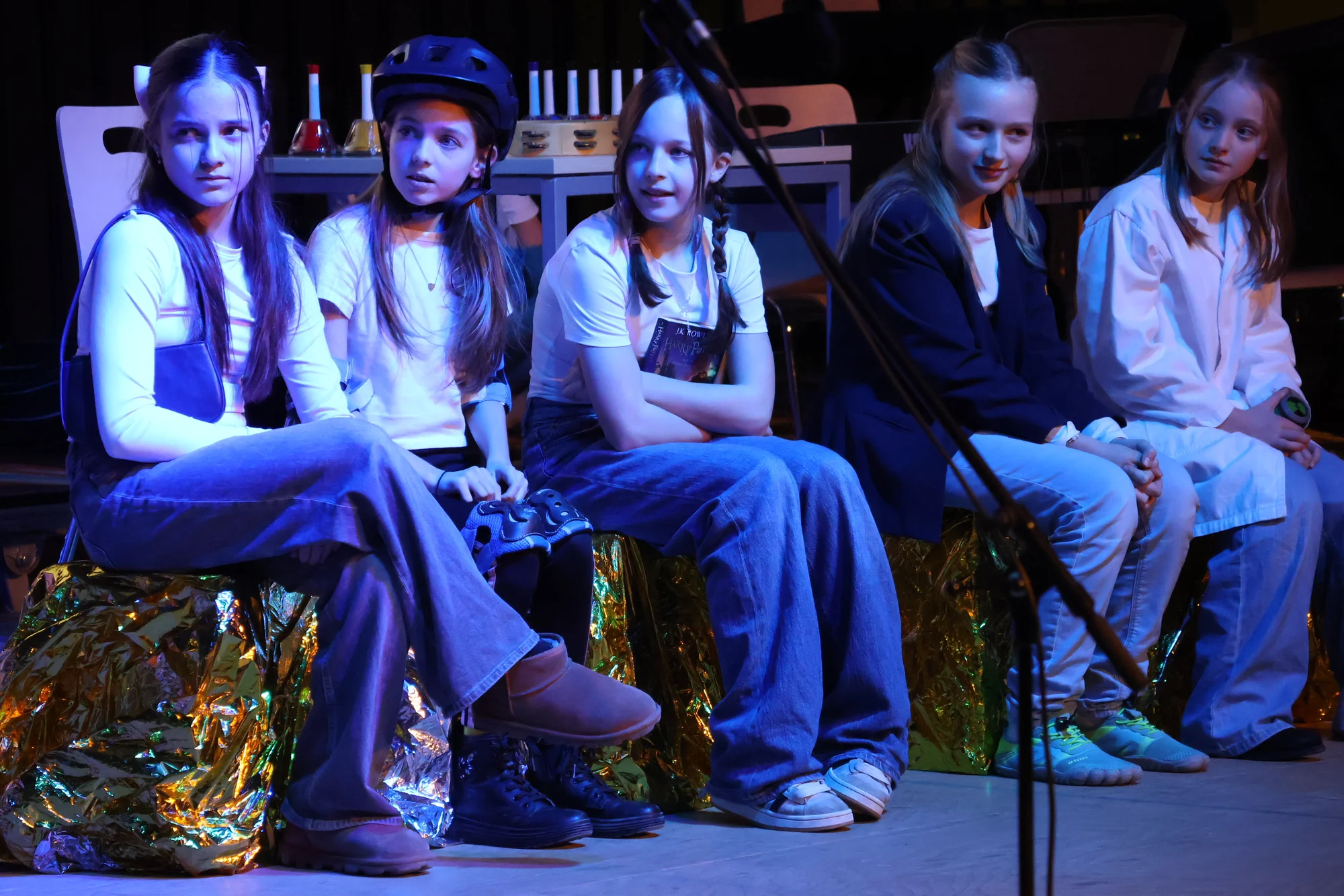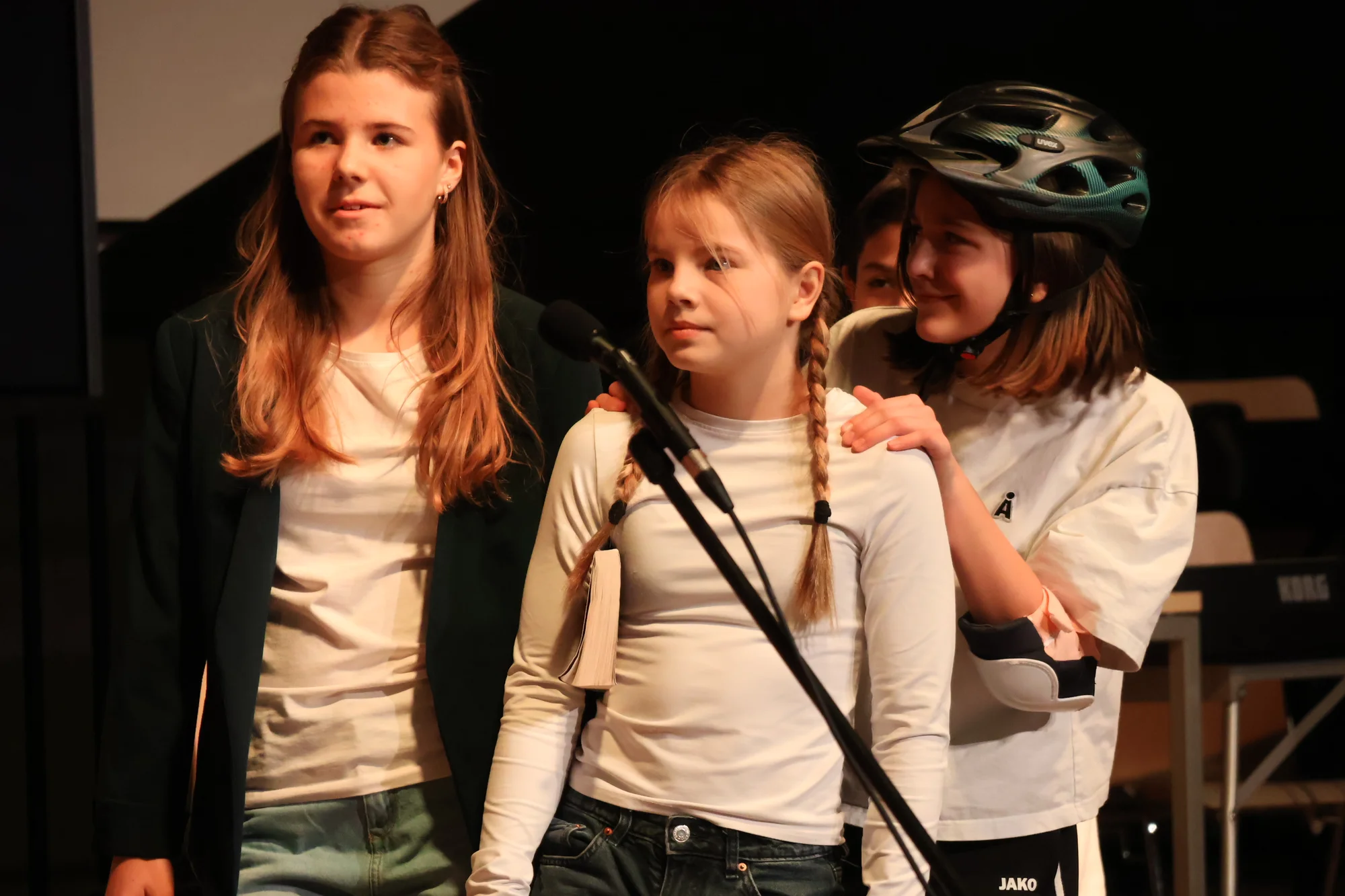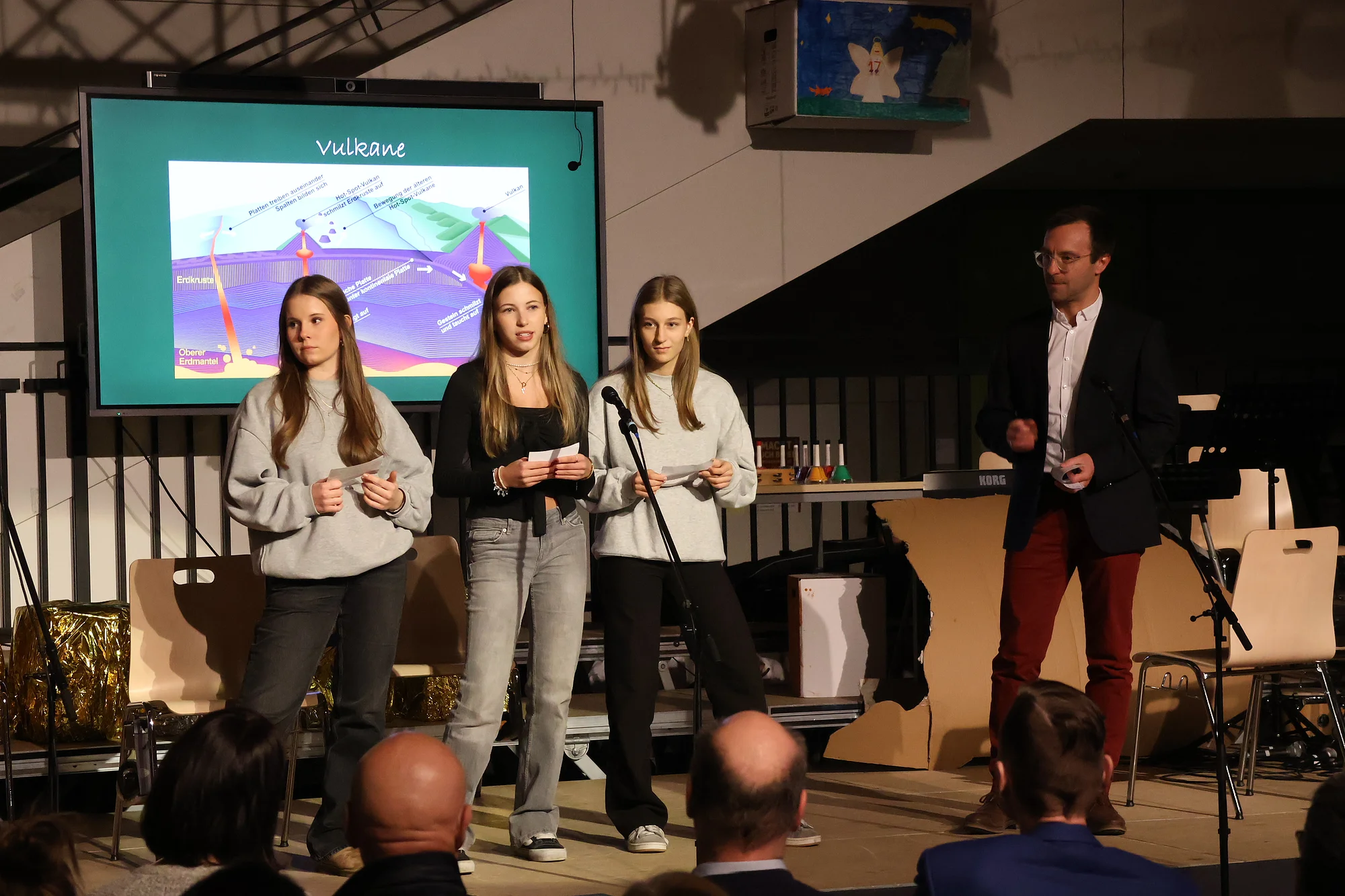 Wie auch im vergangenen Jahr startete der Abend mit einer Theateraufführung. Die Klasse 6e unter der Leitung von Theaterlehrerin Kathrin Mogl präsentierte ihre eigene Version von „Das fliegende Klassenzimmer“ und nahm das Publikum dabei mit auf eine einfallsreiche und humorvolle Fantasiereise durch verschiedene Zeiten der Menschheitsgeschichte.