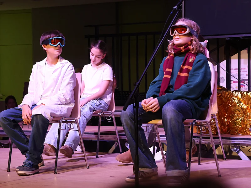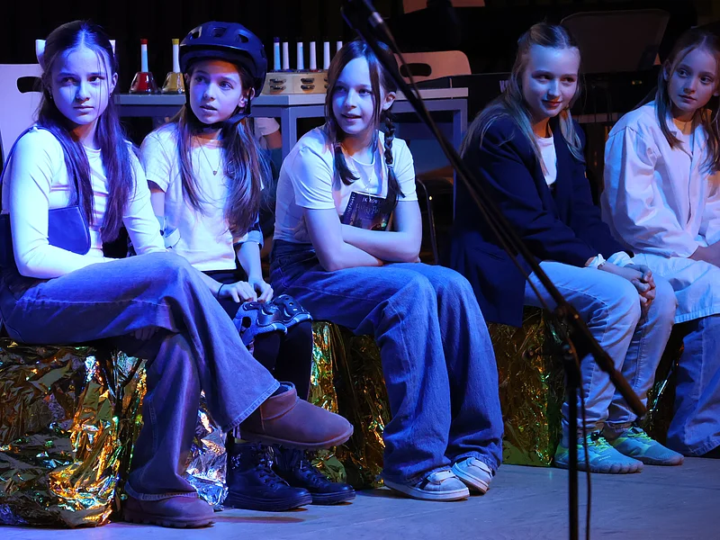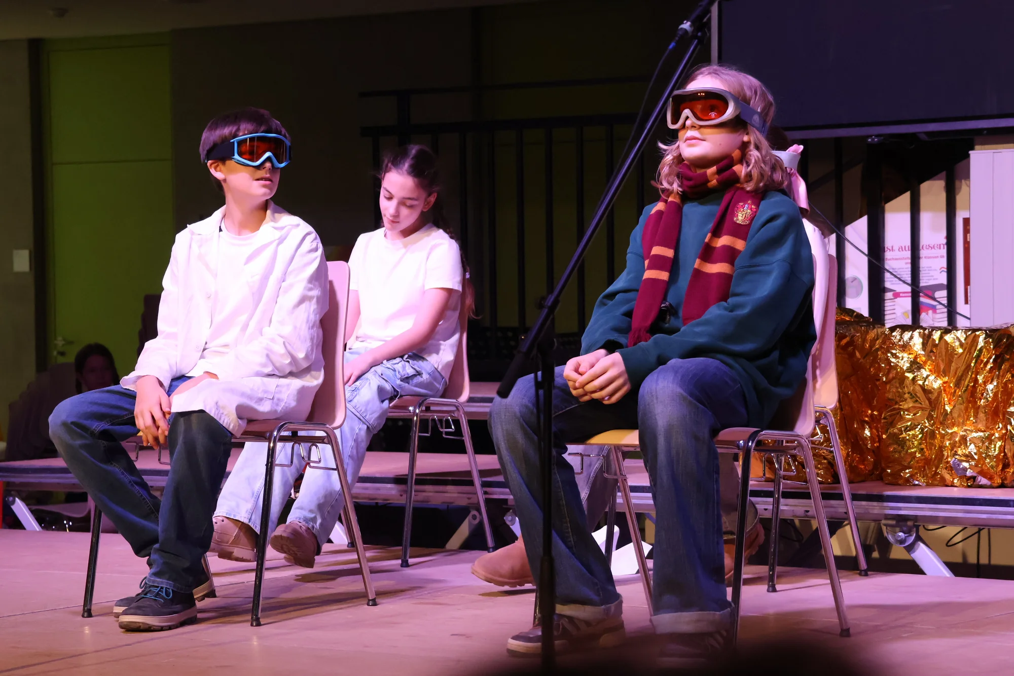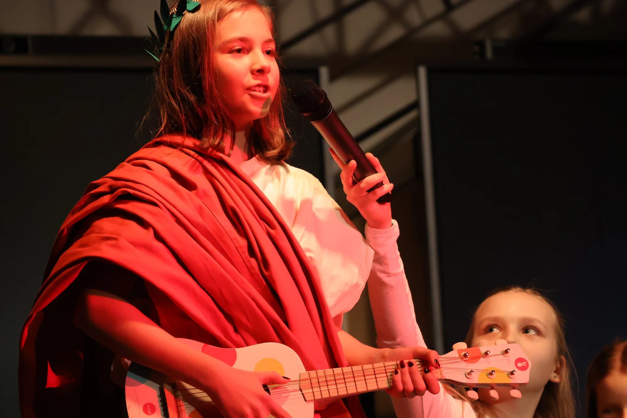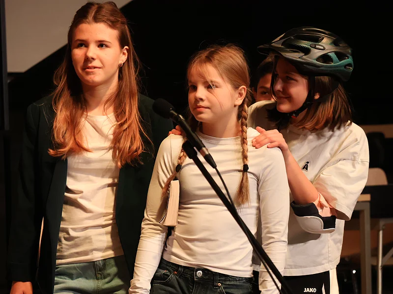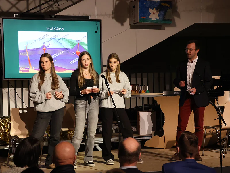 Wie auch im vergangenen Jahr startete der Abend mit einer Theateraufführung. Die Klasse 6e unter der Leitung von Theaterlehrerin Kathrin Mogl präsentierte ihre eigene Version von „Das fliegende Klassenzimmer“ und nahm das Publikum dabei mit auf eine einfallsreiche und humorvolle Fantasiereise durch verschiedene Zeiten der Menschheitsgeschichte.