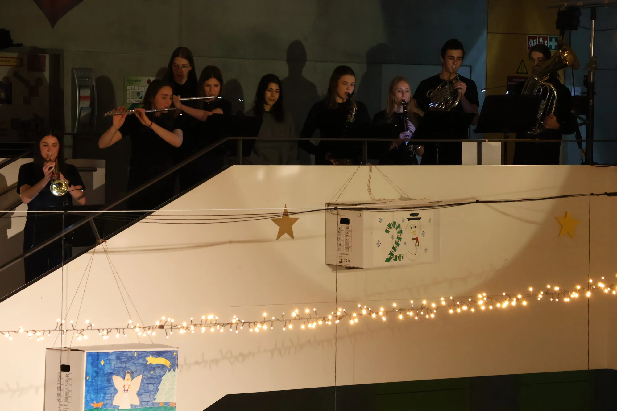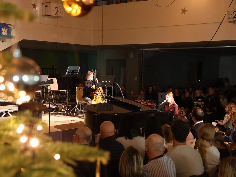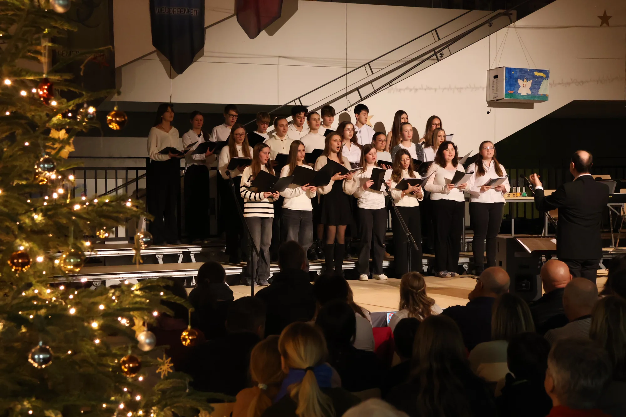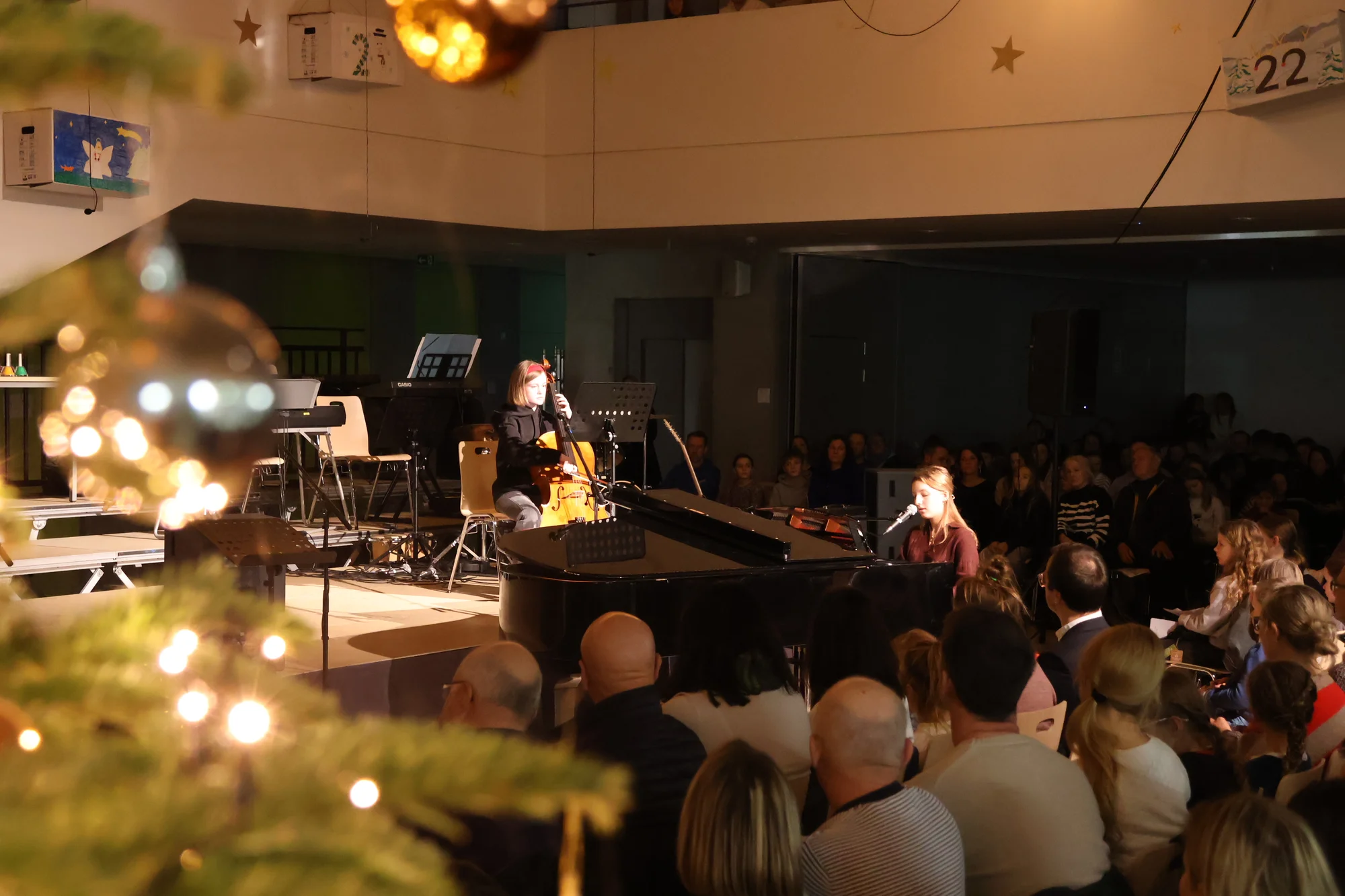 Den musikalischen Höhepunkt des Abends bildete schließlich das Weihnachtskonzert. Eröffnet wurde es vom Schulorchester unter der Leitung von Theresa Schnizlein, das vier Weihnachtslieder erklingen ließ. In der voll besetzten Aula begrüßte anschließend der stellvertretende Schulleiter Stefan Liepold die Anwesenden und lud dazu ein, diese musikalische Stunde bewusst als persönlichen Ruhepol am Ende der Adventszeit zu erleben. Mit den „Pianosternchen“ und „Klavier, Cello & Gesang“ traten in der Aula auch kleinere Musikgruppen auf, die wundervolle Melodien erklingen ließen.