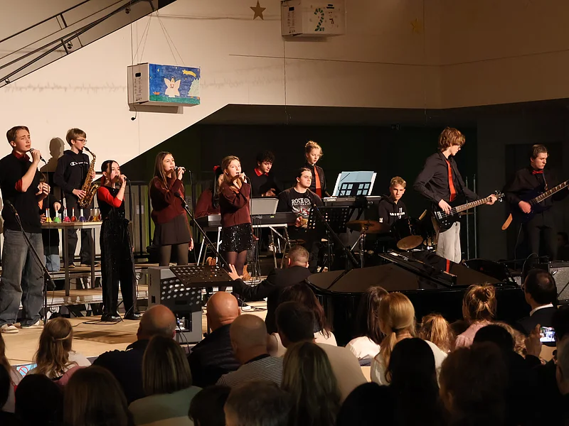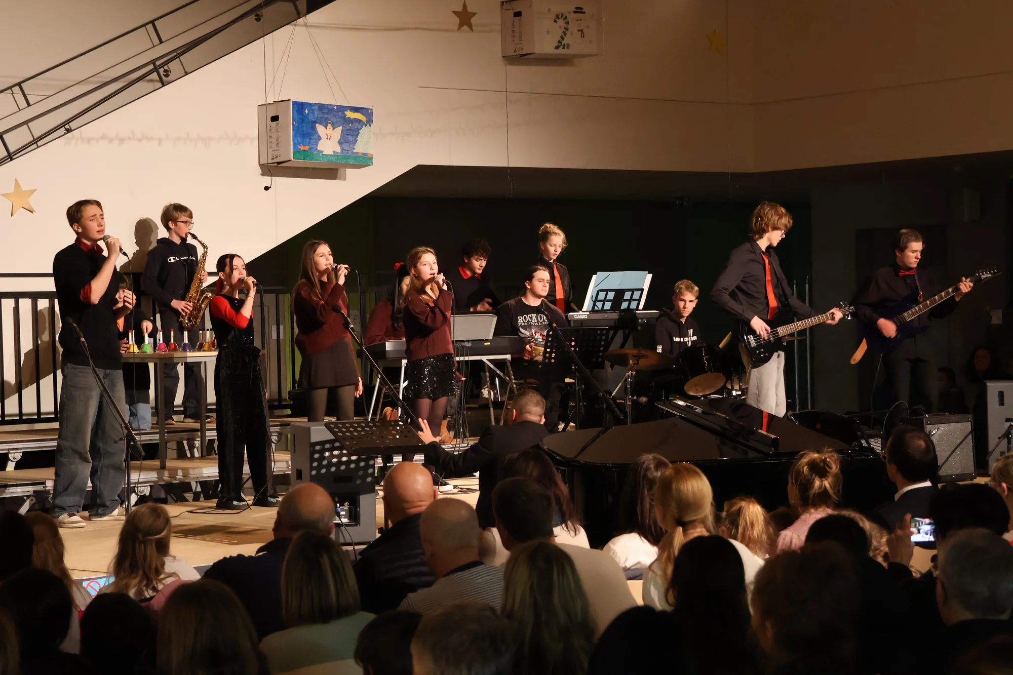 Besonders stimmungsvoll wurde es beim Auftritt des Unterstufenchores unter der Leitung von Johanna Pfaller: Mit „Warum Weihnachten?“, „Zünd ein Licht an“ und „The Colours of Christmas“ wurde das Publikum in eine besinnliche Weihnachtswelt entführt. Der Mittel- und Oberstufenchor und der Lehrerchor, die beide unter der Leitung von Andreas Hilz standen, präsentierten eine stimmungsvolle Mischung aus neuen und traditionellen Weihnachtsliedern und konnten so das weihnachtliche Leuchten in die Herzen der Zuschauer tragen. Zwischendurch wurde es dann weihnachtlich-rockig, als die Schulband unter der leitenden Hand von Lorenz Kemethmüller mit einem nahtlos ineinander arrangierten Medley aus verschiedensten Christmashits zu begeistern und überzeugen wusste.