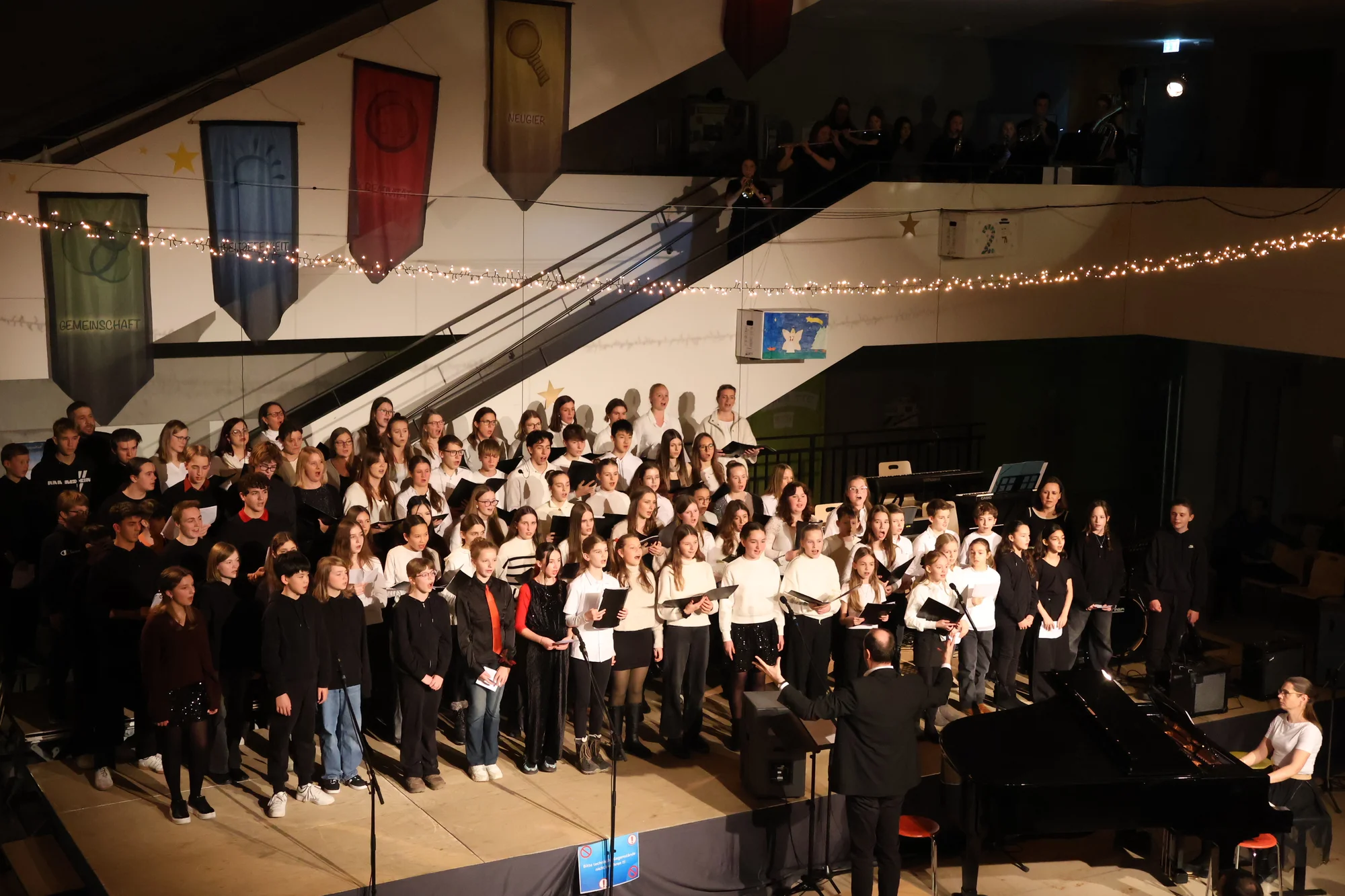 Den musikalischen Höhepunkt des Abends bildete schließlich das Weihnachtskonzert. Eröffnet wurde es vom Schulorchester unter der Leitung von Theresa Schnizlein, das vier Weihnachtslieder erklingen ließ. In der voll besetzten Aula begrüßte anschließend der stellvertretende Schulleiter Stefan Liepold die Anwesenden und lud dazu ein, diese musikalische Stunde bewusst als persönlichen Ruhepol am Ende der Adventszeit zu erleben. Mit den „Pianosternchen“ und „Klavier, Cello & Gesang“ traten in der Aula auch kleinere Musikgruppen auf, die wundervolle Melodien erklingen ließen.