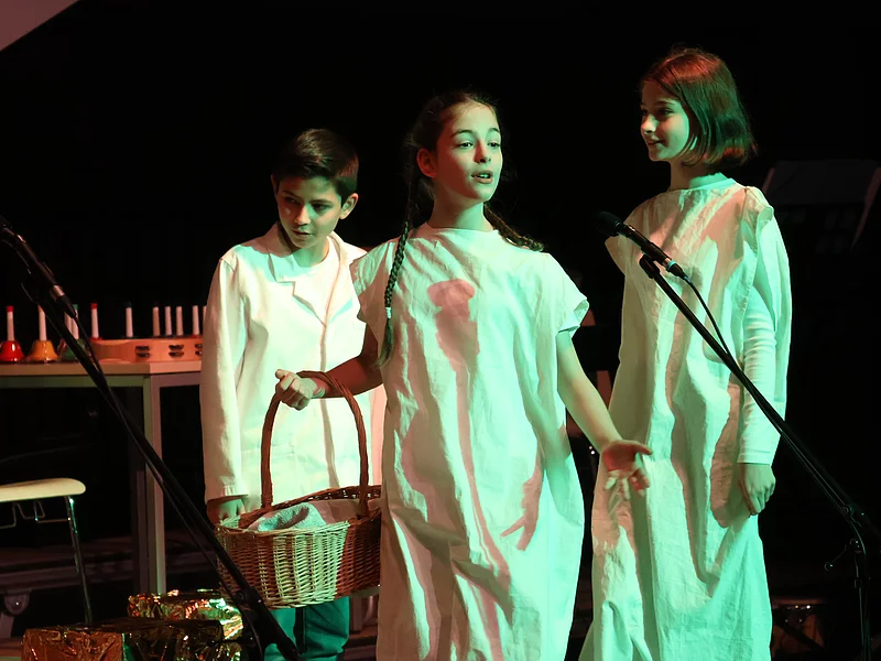 Wie auch im vergangenen Jahr startete der Abend mit einer Theateraufführung. Die Klasse 6e unter der Leitung von Theaterlehrerin Kathrin Mogl präsentierte ihre eigene Version von „Das fliegende Klassenzimmer“ und nahm das Publikum dabei mit auf eine einfallsreiche und humorvolle Fantasiereise durch verschiedene Zeiten der Menschheitsgeschichte.