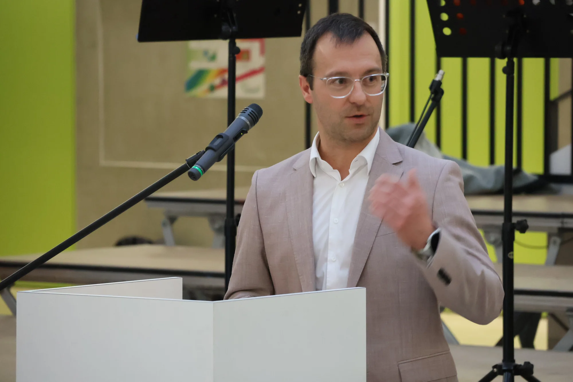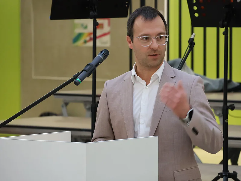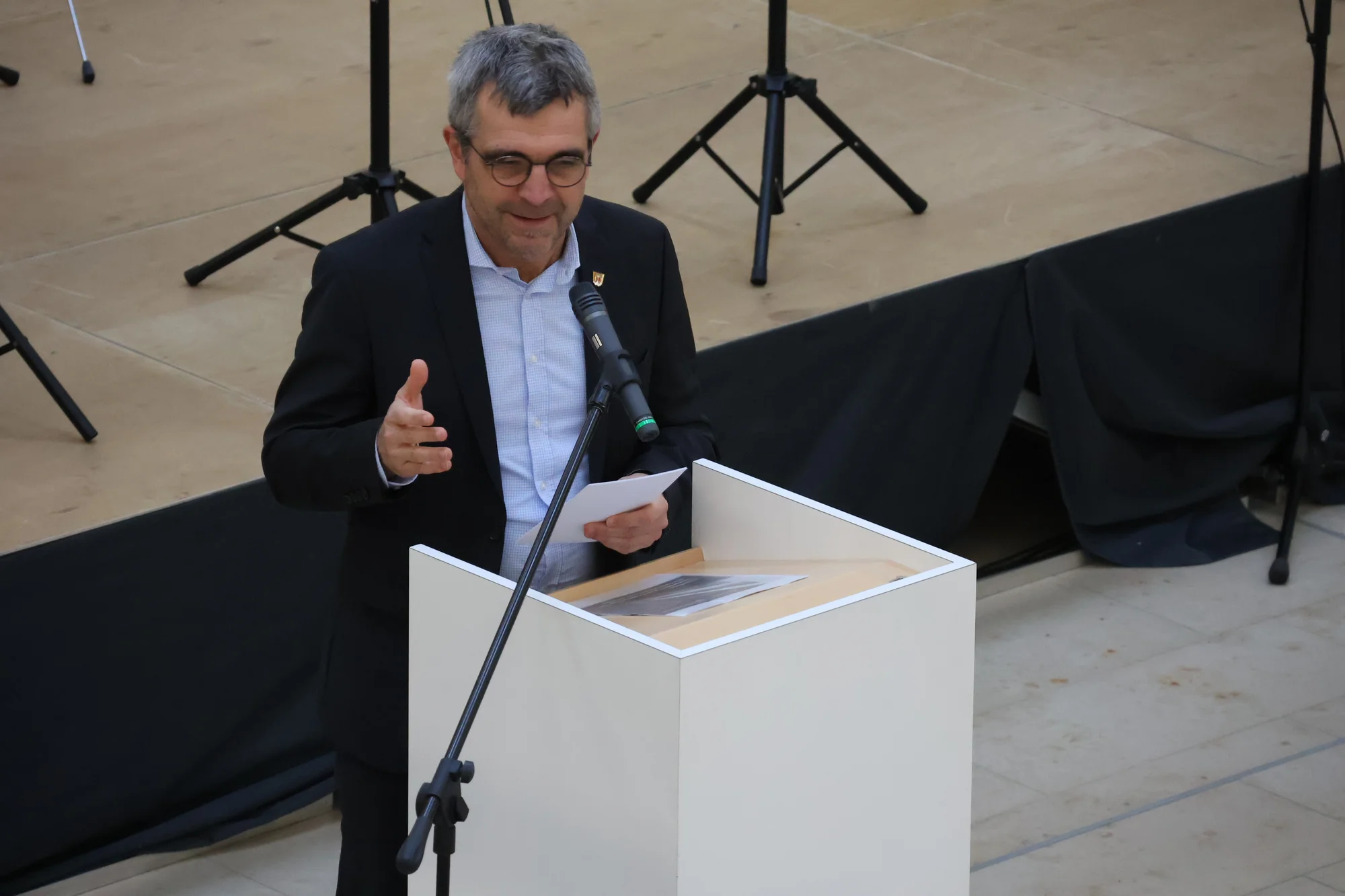 Stefan Liepold, der stellvertretende Leiter des Gymnasiums, schilderte in seinem Redebeitrag die aktuelle Lage der Schule und bedankte sich beim Sachaufwandsträger und allen Beteiligten, dass dieses Erweiterungsprojekt trotz finanzieller Herausforderungen zum wohl vieler Schülergenerationen angegangen worden ist. Der musikalische Rahmen der Veranstaltung kam von der Bläsergruppe des Gymnasiums unter der Leitung von Theresa Schnizlein.