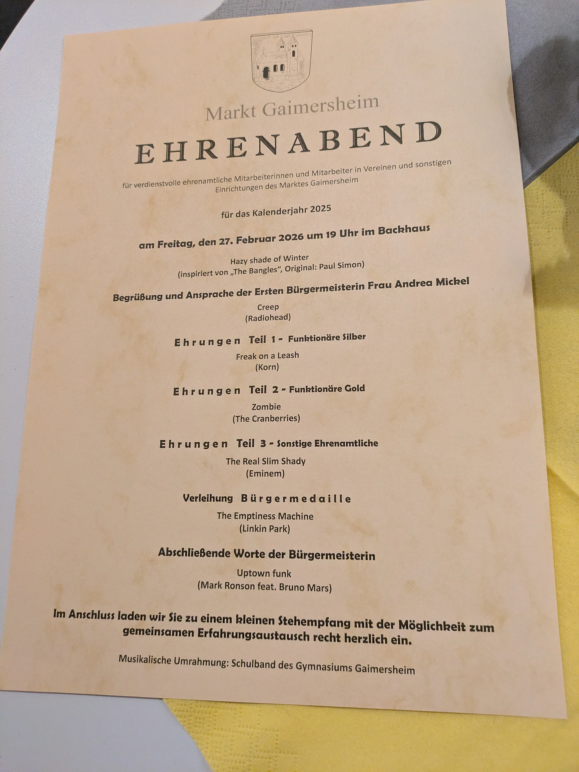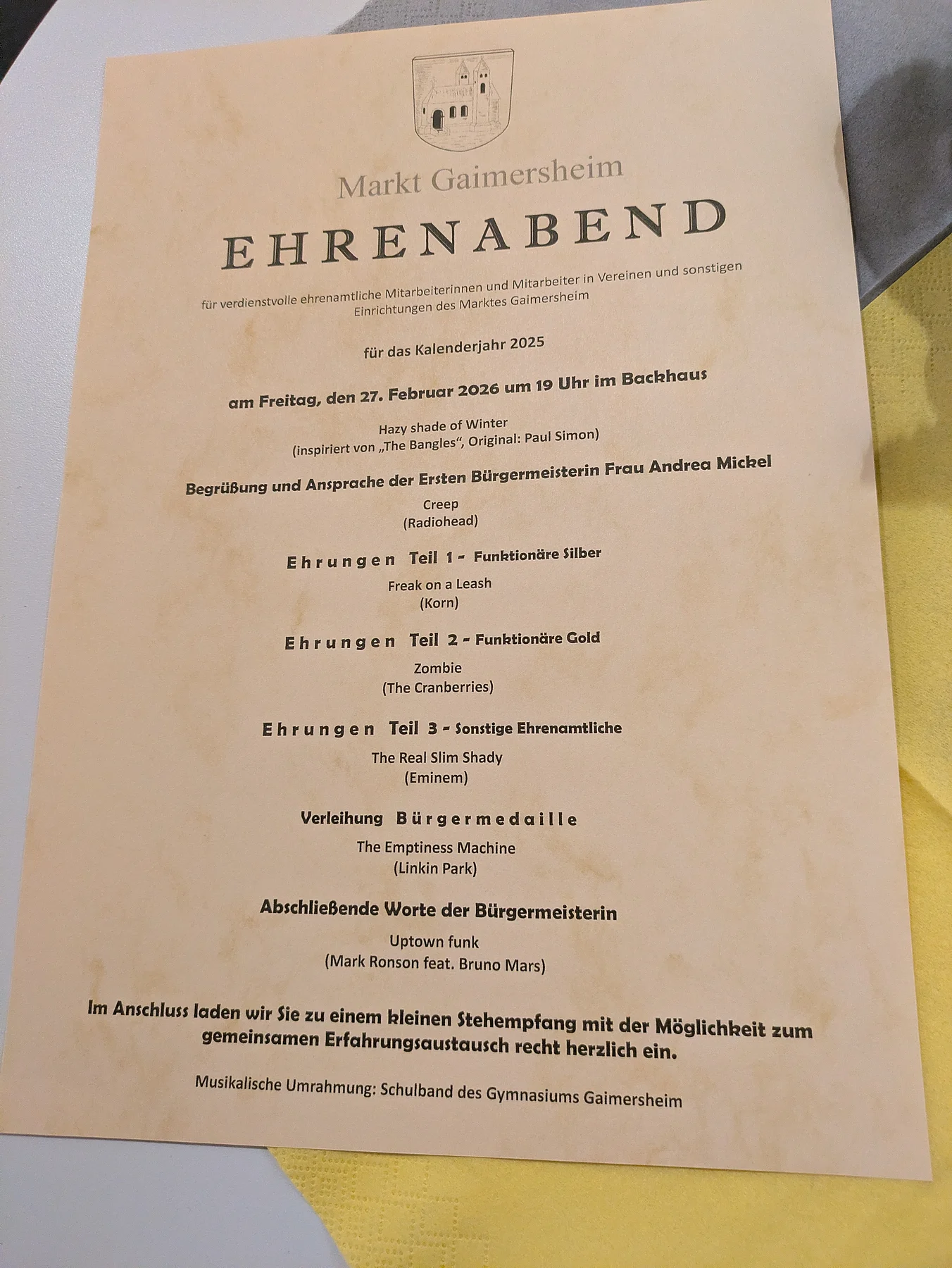 Sich wie Profimusiker und Stars fühlen...Das konnte die Schulband unseres Gymnasiums am Freitag, den 27.2. im Backhaus Gaimersheim. Denn dort fand an diesem Tag der jährliche Ehrenamtsabend des Marktes statt. Dieses Jahr durfte unsere Schulband die feierlichen Lobeshymnen auf das Ehrenamt sowie die Übergabe diverser Anerkennungen für ehrenamtlich sehr engagierte Gaimersheimer musikalisch begleiten und die Veranstaltung somit umrahmen. Bereits am frühen Nachmittag begann der Transport unserer ganzen Technik von der Schule zum Marktplatz. Vor Ort am Backhaus wurde erstmal der Aufführungsort begutachtet. Klassisch über den Hintereingang, quasi backstage, begann man danach, den Veranstaltungsraum für den Auftritt am Abend vorzubereiten. Besonders erfreulich war (herzlichen Dank an Willibald Greiner!) die Hilfestellung bei der Übergabe der Technik vor Ort. Dem Technikteam um Andreas Schmidt war es zu verdanken, dass die Soundqualität nach langem Tüfteln und einem ausgiebigen Soundcheck hervorragend und exzellent klang.