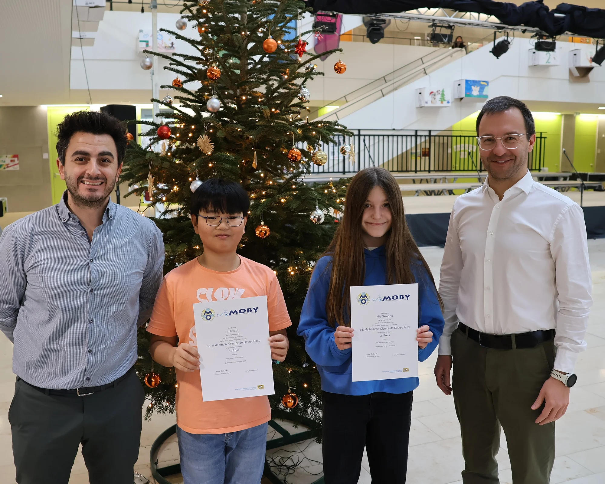 Bei der diesjährigen Mathematik-Olympiade konnten zwei Schüler aus der 6. Jahrgangsstufe unserer Schule außergewöhnliche Leistungen zeigen. Unter einer Vielzahl von Teilnehmern von der Jahrgangsstufe 6 bis 12 erreichten sie herausragende Platzierungen: Lukas Li (Klasse 6b) belegte einen 1. Platz, Mia Skrodzki (6e) einen 2. Platz.