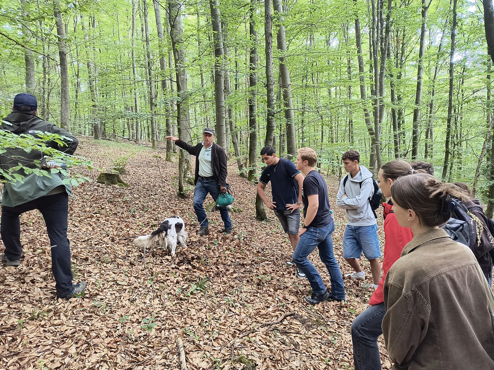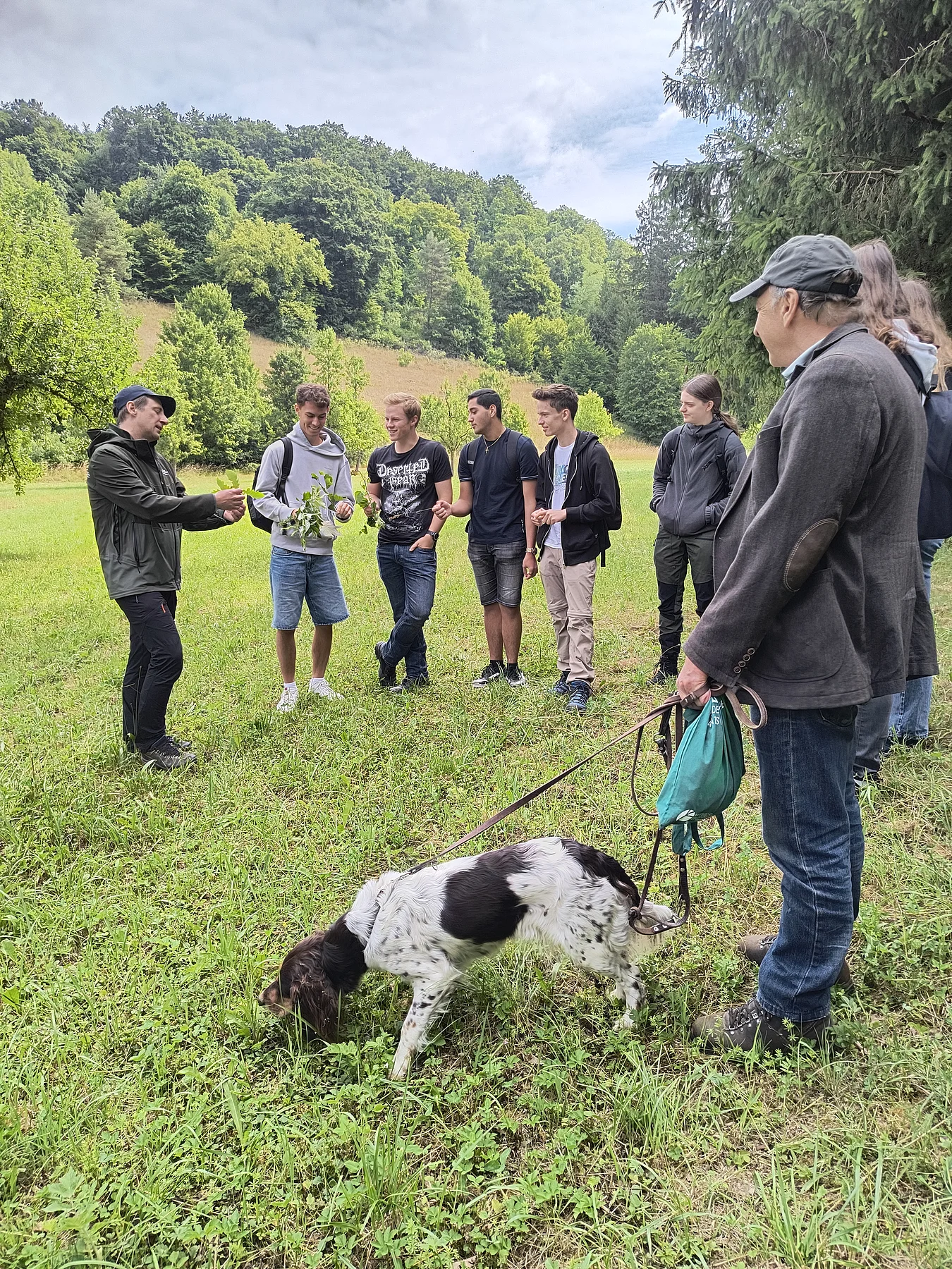 Diesen und vielen weiteren Fragen widmete sich der Geographiekurs der Q12 am vergangenen Mittwoch, dem 9. Juli, im Rahmen einer Exkursion in das Forstrevier Breitenfurt. Begleitet von den Lehrkräften Frau Weidel und Frau Minke-Oberhofer wurden die Schülerinnen und Schüler von zwei Experten durch den Wald geführt und mit zahlreichen Informationen zum Thema Ressourcenmanagement der Wälder versorgt. Neben Herrn Schmaizl, Förster des Forstreviers Breitenfurt und Herrn Habereder, Betriebsleiter des Forstbetriebs Kipfenberg, begleiteten die Gruppe auch die beiden Hunde der Experten – zwei freundliche Spürnasen.