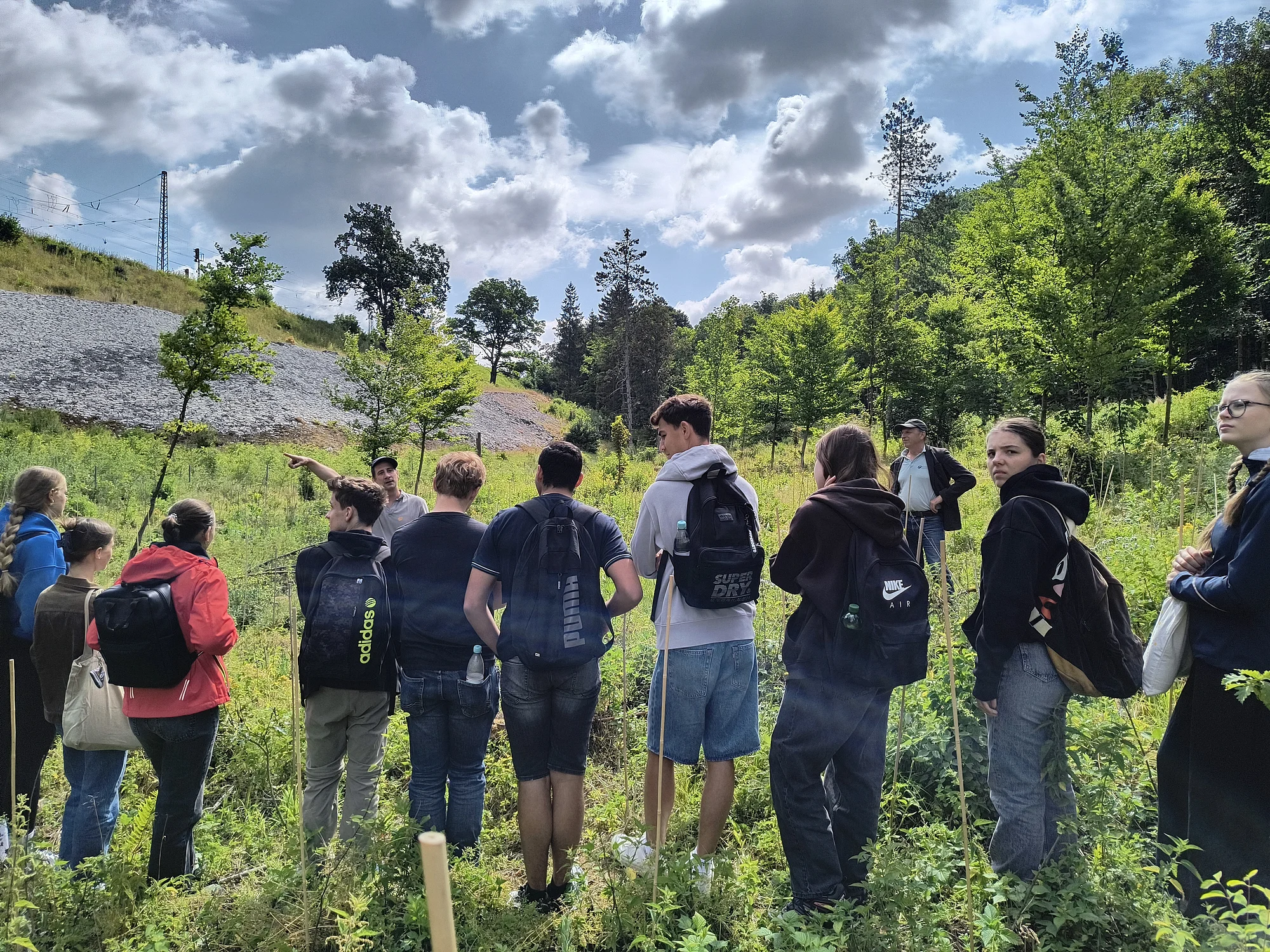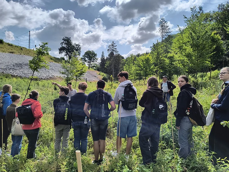 Als Ausgangspunkt diente der Bahnhof Eichstätt, da er durch seine ideale Lage direkt an das Forstrevier Breitenfurt angrenzt. Bereits auf dem Weg zur ersten Station konnte der Kurs Funktionen der Waldwirtschaft live beobachten: Holztransport und -verladung per Zug. Zudem erhielten die Schülerinnen und Schüler Hinweise auf die Weiterverarbeitung von Holz zu Produkten wie Zellulosefasern u.a. für die Textilherstellung. Ein kurzer Exkurs in das Zeitalter des Juras verdeutlichte die geologischen Voraussetzungen für die Wälder. Das mineralhaltige Kalkgestein prägt bis heute die Bodenbeschaffenheit, welche einen entscheidenden Faktor für eine optimale Forstwirtschaft und Waldnutzung darstellt.